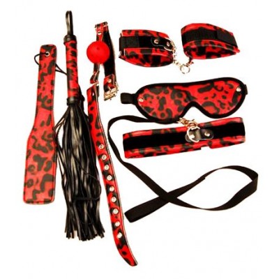 Kit Mistress BondageMaterial: CuerinaNúmero de artículos: 6. Antifaz, látigo, Palmeta, Mordaza, Esposas y Collar de sumisión.Color: Animal print leopardo rojoObservaciones:Todos los artículos con diseño Leopardo